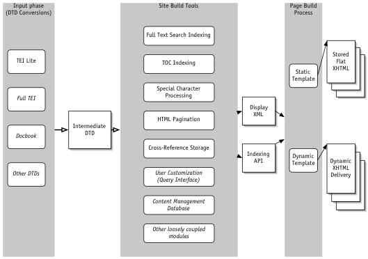 Description and issuesThis diagram shows the architecture of a complete industrial-grade document preparation system. Input DTDs vary widely, but are frequently quite similar, as publishers and other document preparers generally use existing DTDs as a starting point, even if they have created their own customized version. An intermediate DTD that represents document objects in a relatively uniform way allows generic processing modules to be used for common production tasks like table of contents management, editorial indexing (similar to "back of the book" indexes you may be familiar with), full text indexing, and cross-reference management. In the course of conversion from a publisher DTD, information can be replicated into several markup objects, each subjected to different processing. Once the intermediate DTD has been processed by the site-building tools, pages are generated in a "display XML format" where each XML document corresponds to a single web page, and the data within that document can then be turned into HTML easily. Sometimes the pages will contain dynamic elements calculated by the server at the moment of page delivery to the user, in that case, the templates must be executed every time a page is fetched. Many times the content of a page will be completely static, in which case there are 3 common strategies for rendering the page: One is to render the page in batch process at publication time and server the result directly with Apache or another server. This is the fastest method of delivery, but the publication process can be quite slow. Design updates will also require the complete re-generation of the site, increasing the impact of the slower publication process. Another method is to generate all pages dynamically. This makes the publication process much less important: site-building is only required when the input changes (generally not that frequent); furthermore, if the site building process can be made incremental (by tracking input dependencies), further efficiencies are possible. Dynamic generation of pages (especially pages that don't change frequently) is very expensive at delivery time, because of the CPU and memory requirements of templating engines. The most efficient method, of course, is to use a semi-dynamic caching technique, where the outputs of site processing are used by a dynamic generation process the first time they are accessed, but the results are then saved to be delivered directly on future accesses. While this method has the flexibility of dynamic generation, and comes close to the delivery speed of page compilation (minus the small overhead of cache checking), it is not perfect. When design or content changes are made, the caches must be flushed, but under load, the cost of re-compiling the pages on the site may be considerable and lead to performance problems. It is possible to track the dependencies of output pages on both templates and source documents, but this introduces complexity and the concomitant chance of bugs. Bugs in cache and dependency code are often hard to fix because programmers often end up debugging code that isn't being executed. |