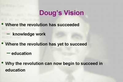 I'll say that to a first approximation it has succeeded for knowledge workers, from schools on up to industry and to government. We all use word processing - never mind the limitations, we all have some understanding of what a bootstrap community is, we have shared whiteboard software, and we've begun to learn about augmenting human intellect. But, where the revolution has not at all succeeded as far as I'm concerned, not even in the tiniest bit, is in education. I was at a meeting last week where Rita Colwell, the director of National Science Foundation, spoke and she said that she had only one message: 'its K-12 stupid'. That was a very interesting thing to hear the director of the NSF, a research foundation, say. Well, I'm here to talk a little bit about why I think its finally time for this revolution to get underway in this particular area.