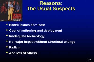 Except for the real successes - the only two technologies to universally succeed - books and chalkboards, now whiteboards. That's not quite charitable enough - there are partial successes - the use of filmstrip and movies and television, the Apple II, Logo - those all did have an impact. But still, in 1983 in "A Nation at Risk" the authors wrote about "unilateral educational disarmament". In 1997 the Shaw report, which was done by the President's Committee of Advisors on Science and Technology, says that "technology in a period has fundamentally transformed America's offices and factories and retail establishments, but its impact within our nation's classroom has generally been quite modest". Why? The usual suspects. I won't have time to go through this in detail.