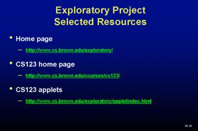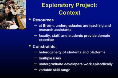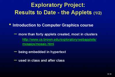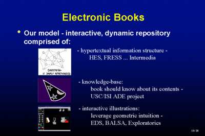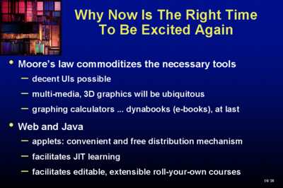Moore's Law, which we've heard a lot about today, makes visual communication possible. It gives us the vividness and immediacy that were predicted for movies and radio, plus - the big one - interaction. Graphing calculators have had impact on the way that Calculus is taught in high schools and in freshman year of college. Dynabooks are finally arriving - not just your laptops but much smaller things designed typically for reading - Rocketbook, Softbook. Standards - yes, I believe they are a necessary evil - are being gathered based on HTML (Blech), XML - a bit better - so that we can get some interoperability between these electronic books. And we have the Web and Java. Applets, just-in-time learning, wonderful for lifelong learning, which is what we are all going to be doing, allows us to get away from Ted's tracked curriculum for students and teachers to configure their own courses and units from a set of components that they can find on the Web. As Howard Rheingold said this morning, it isn't about connecting schools to the Internet, its about teacher education. By the way, have you ever noticed that people say 'teacher training' but 'driver education'... Lets just call it professional development of the teacher corps, and 'its the content, stupid'. We haven't had excitement because we haven't had, to a first approximation, exciting content. That's what we're trying to do a little bit about at Brown as well as other places. ExploratoriesOur focus has been on the use of electronic books and their components.