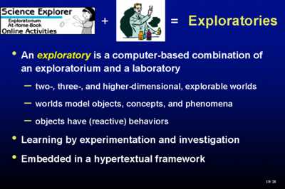 That's what we are working on. We call them exploratories because they combine the best of the exploratorium, where you are free to roam and experiment, with some degree of guidance that you get from a laboratory exercise. Explorable worlds that have behaviors. Alan Kayıs Vivarium, which, by the way, now has a commercial implementation in NearLife, which is showing at various science museums. Learning by doing, by experimentation, by investigation, by discovery, and of course, embedded in a hypertextual framework. Team Approach