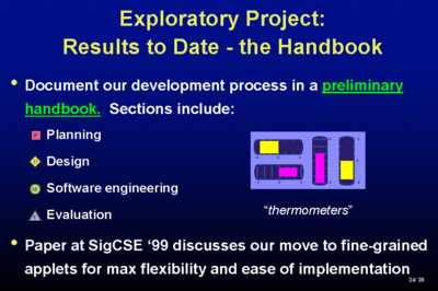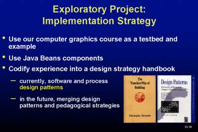 Our implementation strategy is to test on ourselves, to form a Doug Engelbart-style bootstrap community. We use Java Beans and IBM's Visual Age right now as commercially available tools - we no longer have much energy for tool-building. GoalThe thing I think that makes our approach a little bit different, and I hope unique in fact is that we are really trying to mine our experience and produce a handbook. Somebody this morning, I forget who it was, said "we need to update the community's knowledge in a handbook". Bingo. That's exactly what we're trying to do. Codify.So far, we've only gotten to the part of dealing with software and process design patterns - notice that I'm using the word 'pattern' in the Alexander sense of pattern, or the Gang-of-Four design patterns book. We're very fond of patterns at Brown and we teach them starting with my freshman Java class because we think they are so important. We also want to get at some point to learning which kind of pedagogical strategies work and why and incorporate those in patterns. DemosLet me tell you a little bit by showing you some of the ones that have been created by our undergraduates this past year. They come typically in clusters and can build on each other in various combinations. They are embedded in hypertext. I demo during the course of my classroom experience and then people experiment afterwards. Lets look at a couple.