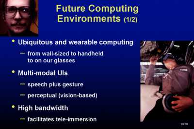Here Thad Starner from MIT's Wearable Computing group is wearing glasses in which there is LCD projection of a perfectly readable VGA resolution screen on his left glass. On the bottom right you see somebody wearing wearable computers. These devices are in research labs transitioning into the real world. Multi-modal interfaces, where we talk to our computers. Remember Apple's Knowledge Navigator, which I think is still a fabulous vision video. I think that there are lots of things right with it as well as things wrong with it. We'll be able to talk to our computers in limited ways. We are working very heavily at Brown in the combination of gesture - both for two-dimensional and three-dimensional tasks - integrated with speech. Other people are working on more passive techniques where you are not wearing anything and video is watching you. You know when you are being watched because you go into a specially instrumented room -this is not surveillance. High bandwidth is coming our way and that will facillitate teleimmersion. Jaron Lanier will, I'm sure, tell you more about that. That's "being there with other people". Collaboration is a theme that you've heard a lot of today. Here is one vision that I think you ought to be aware of.