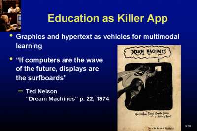 I've believed that education is the killer app since 1962, when I taught my first computer course to high school students and high school teachers. And the thing that really made me believe that computers could do it was, of course, Sutherland's landmark film on Sketchpad, which got me to go into computer graphics. And I have to say - Ivan is the other father of our revolution. {{clapping}} Yes, indeed. Then I got converted to the notion of hypertext by Ted Nelson, whom I met by chance at a technical conference,