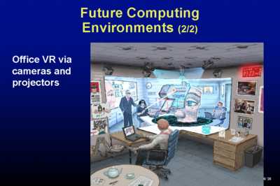 It is Henry Fuchs' predominantly, at the University of North Carolina. He's a real pioneer in display and tracking technology and in virtual reality. He and his group are working on office virtual reality, brought to you courtesy of cameras and projectors, all cheap, in the ceiling. The cameras are callibrating every pixel every so many microseconds at every location in the room, constructing a depth map and reflection map of the entire room in realtime, so that as things change in the room that is being captured the maps are updated.. With that kind of information you can project not just on walls, on special devices, but anywhere in the room and what you can do is pipe remote environments to any particular place and create a shared work or play environment. The diagram shows Henry and remote colleagues designing the next generation head-mounted display, which is one of Henry's specialties. Lifelike avatars are being brought to you by this technology. The idea is to make it cheap and not to make it something that is special and lives in research labs only.