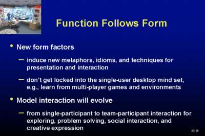 So, these are the kinds of environments that we're going to see in the future. Now, I think that that is going to have to force a paradigm shift in the way we think about applications. In architecture you learn that form follows function. I claim that function should follow form, and that when you get these new form factors you really have to think in a new way about what an application is. Applications will not be what they have been today. We need new idioms, metaphors, and techniques for presentation and interaction in these new computing environments. We want to move away from a desktop metaphor that has served us pretty damn well for well over two decades. We're still all collectively living off Doug and company's heritage and its time to get on to other things. Model interaction in the future, i.e. interaction with and through models and simulation, and Doug's style of collaboration, will be about team-participant interaction, not human-computer interaction. Computers should go away, they should fade into the background. They will do that for exploring, problem solving, social interaction, and various forms of creative expression. Call to Action