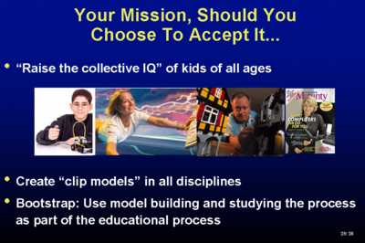 So. last slide. Your mission - certainly mine, but it could be yours should you choose to accept it, is not just to talk about raising the collective IQ of organizations. Lets talk about raising the IQ of kids of all ages and do lifelong learning, starting at a very young and tender ago and going all the way to the very end. Here's what I'd like to do, in addition to everything else that's being done. I'd like there to be some form of national effort to create clip models in all disciplines. A clip model, like clip art, contains everything you need for the task at hand. It needs behavior, it needs simulation capabilities. It's not a silver bullet. There are lots of other ideas - toys that have computers built into them are also terrific learning devicies, but I think that we should be able to get the classic interactive textbooks done for chemistry, physics, mathematics, engineering, biology, social dynamics, archeology, etc., if we have a national effort by which we all engage by submitting to repositories, not through some centrally controlled process.