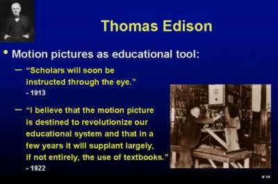 and I saw instantly that a combination of these ingredients was the right way to go for multi-modal learning. I contrast multi-modal to uni-modal, which is what I 'enjoyed' in college. For example, I studied fluids and I had a big textbook filled with text and equations and exactly one diagram - it was on the cover. No geometric intuition at all. Ted, of course, had it right again - "if computers are the wave of the future, displays are the surfboards" {from Dream Machines}, and boy are we surfing on the Web today Related WorkLet's take a look at what some other visionaries have said about various kinds of gadgets that they invented or used in education.Thomas Edison thought that the answer was the visual medium and the movie projector that he invented.