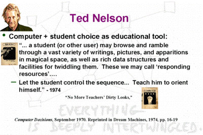 But again, it didn't happen. Here's what Ted had to say in a wonderful in an anti-classical CAI - the drill-and-kill, "now Johnny", school of educational software - in which he talked about computers and choice and talked about a magical space, the sort of magical space that Ivan visualized, for example, in his AFIP paper in 1965, about virtual reality.