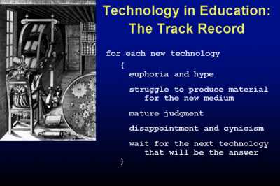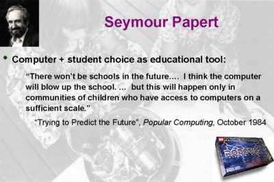 He visualized that there would be a deconstruction of curricula in just the sense that Ted talked about in ³No More Teachersı Dirty Looks², and that hasn't happened, for better or for worse. By the way, Mindstorms Lego - get into it. It's amazing. Alan Kay. The responding resource, the Dynabook, based on simulation, that's at the core of what we're talking about in education today and fortunately Alan's vision is finally being realized today. We've done a variety of educational software projects since I started on this in 66-67, not all under my direction, and the last one done by a spinoff company. We tried and we, too, failed in a major way.