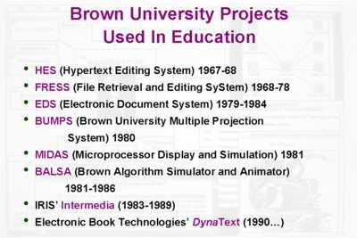 Paul Saffo's Introduction of AndyI was talking with a gentleman physicist named Edward Teller and he told me that there was something about Hungary. Turned out that there was one high school that a disproportionately large number of scientists who were on the Manhattan project came from. One wonders what was going on in Hungary at the time.Well, one wonders what was going on at Swarthmore College in the early 1960s because both Ted Nelson and our next presenter, Andy van Dam, both were at Swarthmore at the same time and both have had fascinating collaborations over the years. Andy is currently, and has been for some time, the T. J. Watson Professor of Technology and Education and a professor of Computer Science at Brown University, a department that he helped to establish. Like Ted, he is fascinatingly visionary, he has pushed farther on the edges of hypermedia and education than anyone else. He has one disqualification, however, for being a true visionary - he can actually complete projects. But I think when you hear Andy talk you will not hold that small defect against him. Andy's PresentationI want to thank you Paul {Paul Saffo, organizer of the Engelbart Symposium} for letting me take part in this wonderful celebration of Doug and of his fabulous team and of the mother of all demos. I don't think we'll see anything like that for decades, probably. But I've got to ask, what have I ever done to you to have to go on after Ted Nelson. You just saw a new medium, folks - standup techno-comedy. {{laughter and clapping}}I first want to start off by thinking my co-pilot and navigator here, Rosemary Simpson. She's going to be trying to put the pieces of this show together in an article much as she did for the Bush Symposium that we ran at MIT three years ago. And also a host of other folks at Brown who helped me put this pitch together.
