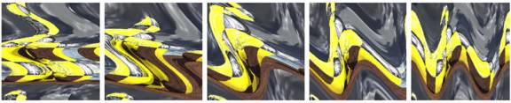 Second, a genetic morph kind of linear interpolation that is made possible by the genetic algorithms from which the behaviors originate. Originally described by Sims, this transition between two behaviors is accomplished by walking the expression trees in parallel from the roots. If the behaviors have a common ancestor, much of the structure will be similar between expressions. The interpolated expression retains however much of the structure is identical between them, then linearly interpolates between the nodes that are different. The interpolation parameter is time varying to produce a smooth transition between images.