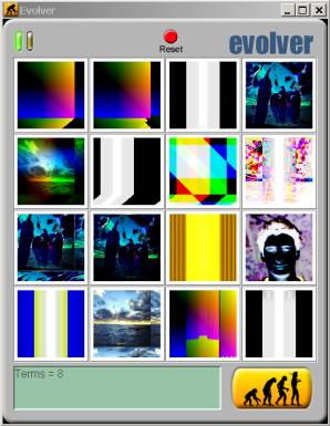 This is interesting for two reasons. This first is that the human performs a purely critical role in the artistic process by expressing his or her opinion of intermediate works. The 'innovation' is left to the computer. The human user does not have to have any particular artistic skill or knowledge of image processing. It is possible for the user to optionally adjust a number of parameters controlling the genetic algorithms and indirectly affect the creation process as well.