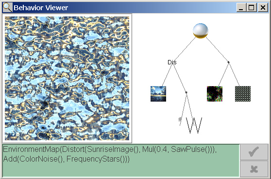 Sims showed that the artistic process can similarly be phrased as natural selection or optimization problem, so genetic algorithms can be used to produce images. We consider an image to be equivalent to an expression in a richly expressive filter language. An expression, also called a “behavior” in this paper, is an individual as presented to the genetic optimizer, and the terms (parse tree nodes) of the expression are traits. The fitness function is the user’s aesthetics, and is measured by evaluating the expression and asking the user if he or she likes the image produced.
