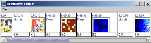 The animation editor allows graphical editing of an animation sequence. Individual EL expressions can be dropped onto the thumbnail frames. The resulting animation will consist of the expressions and morphs between them. The user can type in a duration for each morph and for how long an expression should be displayed. The width of a frame indicates the duration. The number in the upper left is time code, useful for syncing animation to audio. Animation sequences can be saved out to human readable files that are playable by an external Evolver animation player. These animation sequences are entirely procedural so they require very little storage space.