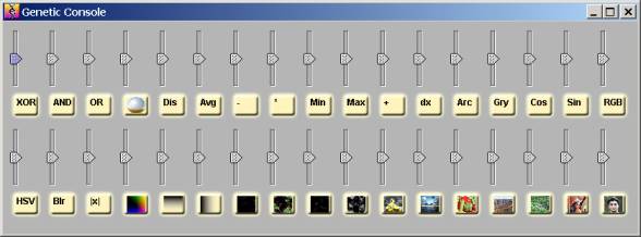 The genetic console is the graphic interface by which the user can influence the probability of any operator appearing. Pushing the glowing buttons toggles whether a given operator will appear. The sliders control the relative probability of any expression appearing, where up = maximum probability. The file defaults.gp is used to initialize these values. The user may also edit the text file directly before the program is loaded. defaults.gp allows control over the mutation probabilities as well. No GUI is provided for editing the mutation probabilities.