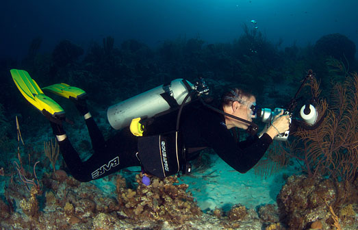 I got started in underwater photography in 1986, when I acquired a Nikonos V system. This is a viewfinder, non-SLR camera which is great for wide-angle photography, but not for "fish portraits" and other close-up work. I started using a housed camera in 1992: a Nikon 8008s in a Tussey housing. I replaced this in 1997 with a Nikon F4 in a Nexus housing and used Ikelite Substrobe 150 and Substrobe 200 strobes. In January 2005 I switched to digital and to a Nikon D70 in a Nexus housing. In the summer of 2006 I replaced the D70 with a Nikon D2x in a Seacam housing. I replaced the strobes with Ikelite DS125's. I replaced the D2x with a Nikon D800 in January 2014, again with a Seacam housing. In July 2016 I replaced the strobes with Ikelite DS160's. All of my photos shown here were taken with the housed cameras, mostly with either a 60mm macro lens or a 105mm macro lens. In some of those shot with the latter I've used a +2 wet diopter that allows me to get closer to the subjects. In January 2010 I acquired a SubSee +10 diopter from ReefNet, which allows me to get even closer. A few photos were taken with a 20mm lens and some with a 35mm lens. Starting in July 2014, the wide-angle photos are taken with a 16-35mm zoom lens. Almost all the photos shot on film were with Fuji Velvia.