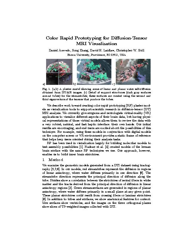 [Zhang et al., 2001] Song Zhang, Cagatay Demiralp, Marco DaSilva, Daniel Keefe, David H. Laidlaw, Benjamin D. Greenberg, Peter J. Basser, Carlo Pierpaoli, E.A. Chiocca, and T. S. Diesboeck. Toward Application of Virtual Reality to Visualization of DT-MRI Volumes. In Proceedings MICCAI, October 2001. (pdf) (bibtex: Zhang-2001-TAV). |
