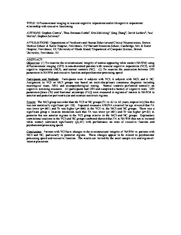 [Cooley et al., 2014] Sarah A. Cooley, Ryan Cabeen, David H. Laidlaw, Elizabeth M. Lane, Jodi M. Heaps, Jacob D. Bolzenius, Laurie M. Baker, Lauren E. Salminen, Staci E. Scott, and Robert H. Paul. Posterior brain white matter abnormalities in older adults with probable mild cognitive impairment. Journal of Clinical and Experimental Neuropsychology, 2014. (pdf) (bibtex: Cooley-2014-PBW). |