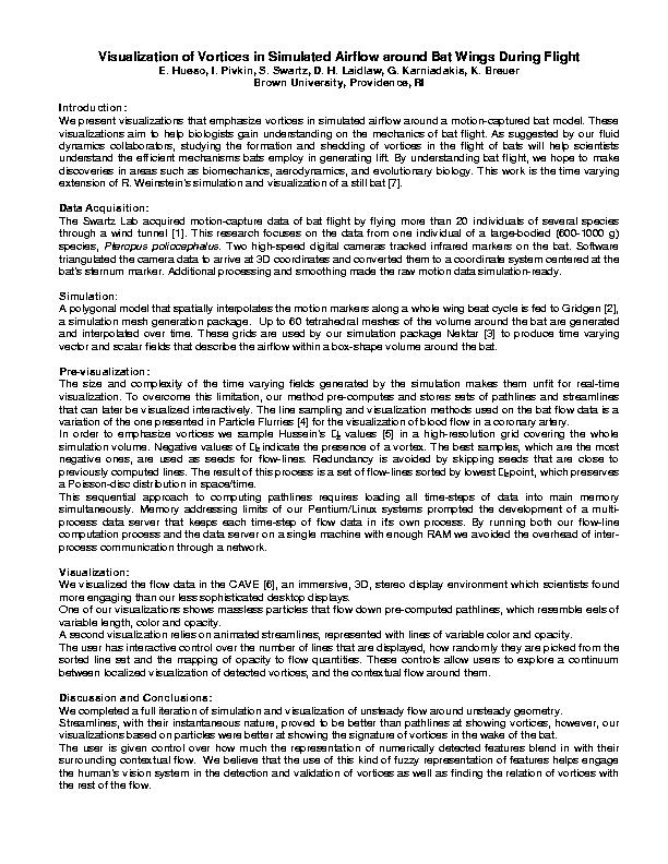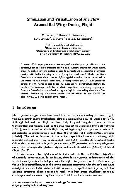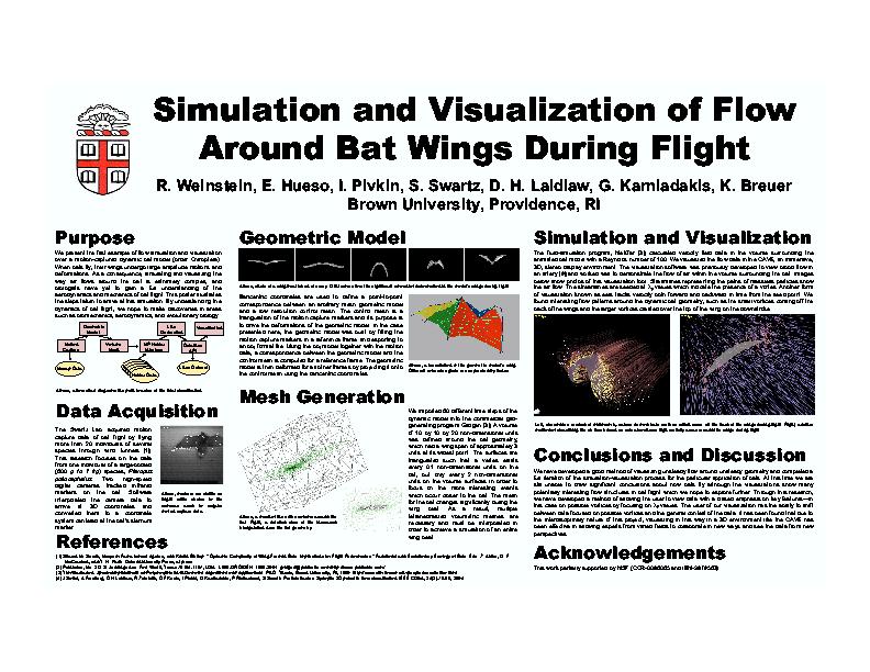 [Weinstein et al., 2002] Rachel Weinstein, Igor Pivkin, Sharon Swartz, David H. Laidlaw, George Karniadakis, and Kenneth Breuer. Simulation and Visualization of Air Flow Around Bat Wings During Flight. Technical Report CS-02-16, Brown University Computer Science Department, August 2002. (pdf) (bibtex: Weinstein-2002-SAV). |