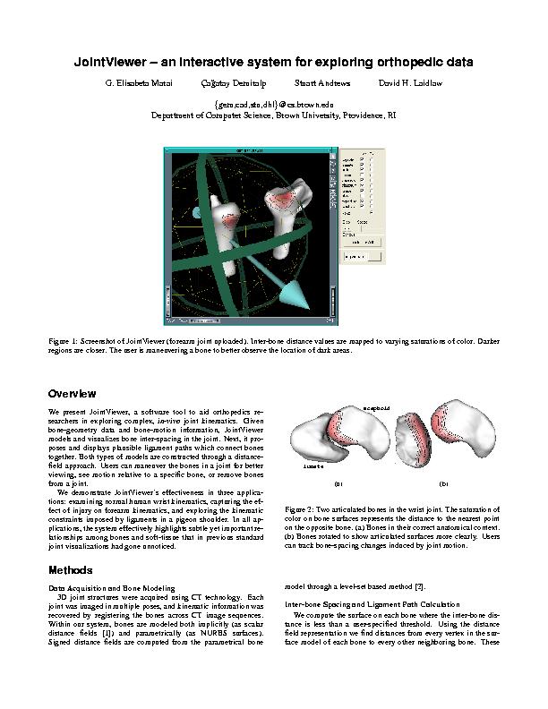 [Marai et al., 2002] G. Elisabeta Marai, Cagatay Demiralp, Stuart Andrews, David H. Laidlaw, Cindy Grimm, and Joseph J. Crisco. Visualization of Contact Areas and Ligament Paths in Joints. Technical Report CS-02-15, Brown University Computer Science Department, August 2002. (pdf) (bibtex: Marai-2002-VOC). |