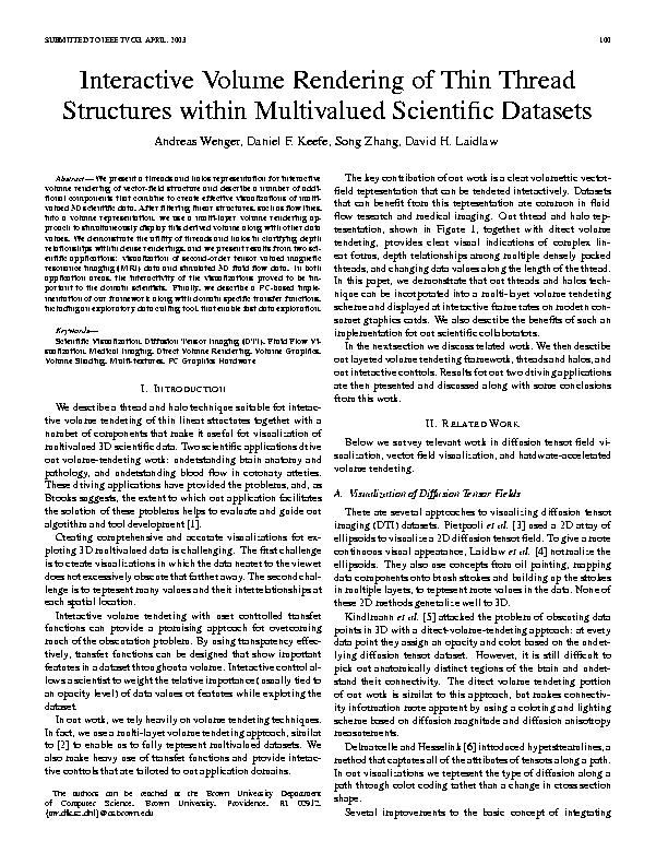 [Zhang et al., 2003] Song Zhang, Cagatay Demiralp, and David H. Laidlaw. Visualizing Diffusion Tensor MR Images Using Streamtubes and Streamsurfaces. IEEE Transactions on Visualization and Computer Graphics, 9(4):454-462, October 2003. (pdf) (bibtex: Zhang-2003-VDT). |