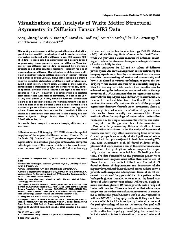 [Piper et al., 2015] Rory J. Piper, Shadia Mikhael, Joanna M. Wardlaw, David H. Laidlaw, Ian R. Whittle, , and Mark E. Bastin. Imaging signatures of meningioma and low-grade glioma: a diffusion tensor, magnetization transfer and quantitative longitudinal relaxation time MRI study. Magnetic Resonance Imaging, 2015. (pdf) (bibtex: Piper-2015-ISM). |