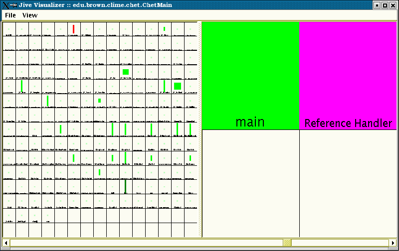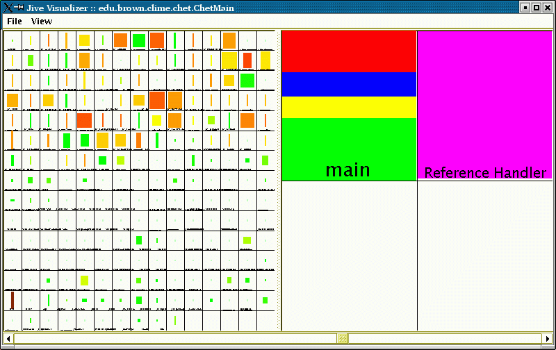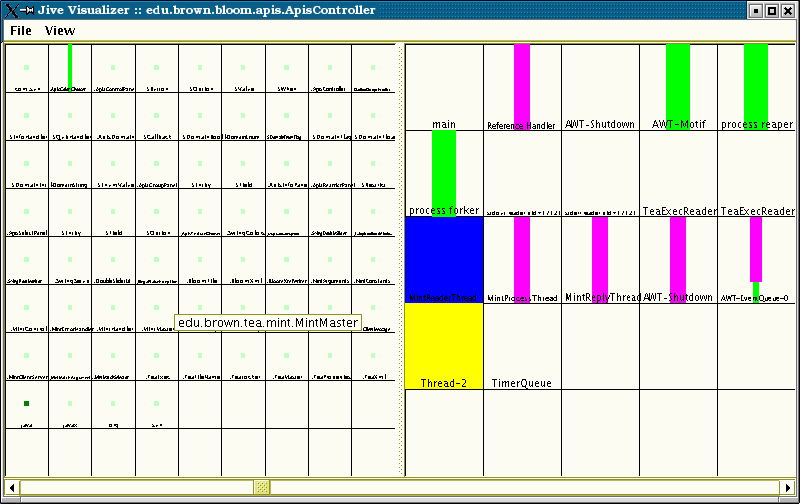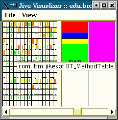 JIVE is a tool for visualizing a Java program in action. It does a minimal instrumentation of the user's Java program initially and then runs the instrumented program. The instrumentation slows the program down by a factor of 2 (or so, depending on the application dynamics). From the instrumentation, JIVE is able to provide a display showing what the program is doing as it is doing it. The display includes counts of the number of calls within each class (or package), number of allocations of each class, number of allocations by each class, number of synchronizations on each class. In addition, the display shows the state of each thread and the changes in state as well as synchronizations. States include IO, WAIT, SLEEP, BLOCKED, RUN, RUN SYNC, and DEAD. This display can either be a box display showing the fraction of time each thread spends in each state or a horizontal display showing the time history of threads. Synchronizations on a thread are shown in both views, one by darkening the display and the other with arrows connecting the synchronized threads.