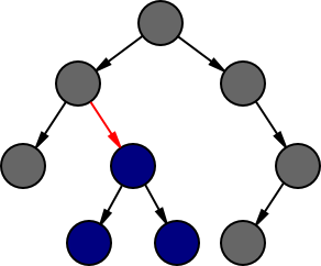 A cursor represents an edge (shown in red) and has two parts: a representation of the (possibly empty) tree below that edge (shown in blue), and the (possibly empty) rest of the tree around that edge (shown in grey). The simplest representation of the part below is the subtree itself, but we have some choices in how we represent the rest of the tree, depending on which operations we wish to support. Note that a cursor can also be located above the root even though there is technically no edge above that node.