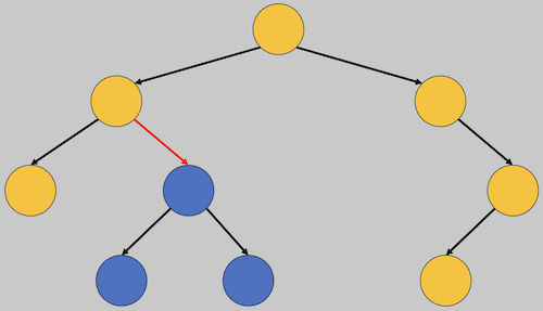 A cursor represents an edge (shown in red) and has two parts: a representation of the (possibly empty) tree below that edge (whose nodes are shown in blue), and the (possibly empty) rest of the tree around that edge (whose nodes are shown in yellow). The simplest representation of the part below is the subtree itself, but we have some choices in how we represent the rest of the tree, depending on which operations we wish to support. Note that a cursor can also be located above the root even though there is technically no edge above that node.