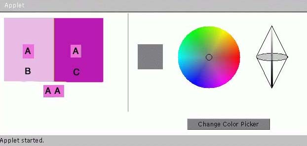 The following exercise is set up similar to Plate 1, but the objective differs. In this exercise you want the foreground color(A) to appear to be the opposite of the color across from it. This excercise builds on what was learned in Plate 1 and Plate 2, seeing how color is influenced by its sorroundings. Again this is a different type of influence. In the example below A is a middle pink, B is a light pink and C is a dark pink. So the A on the C Background should look like the opposite color of the B background and the opposite for the A on the B background.