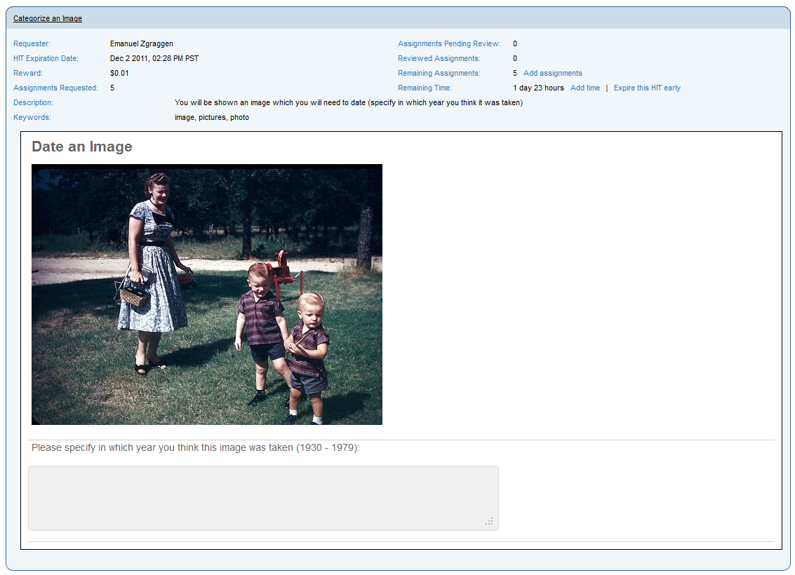 Even for humans this task is really hard. In order to get an estimate of how good humans are, I randomly sampled 50 images from each decade and posted them on Amazon Mechanical Turk as a classification HIT (Human Intelligence Tasks). Each image was dated by 5 different workers and each HIT was rewarded with 0.01$. The workers were asked to assign a specific year in the range of 1930 - 1979 to each image. The 1'250 results were compared against the ground-truth and converted into a simple accuracy (number of correct classifications / number of trials). For this evaluation I only considered if the decade was correct. With an accuracy of 26.64% humans are only slightly better than chance (20%). One interesting phenomenon is that humans tend to classify images to more recent decades. A lot more images got classified to the 70s category than to any other.