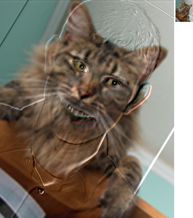 colors are often a low-frequency phenomenon. Hence, if an image/object can be easily recognized just by color (not because of its texture/shape), it can be used as a good candidate for the low frequency image. For example, if we use the cat image as the low frequency in the hybrid and DerekPicture.jpg as the high frequency, the effect is less recognizable than the opposite mixing order, for example, it is somewhat hard to recognize Derek in the third image below.
