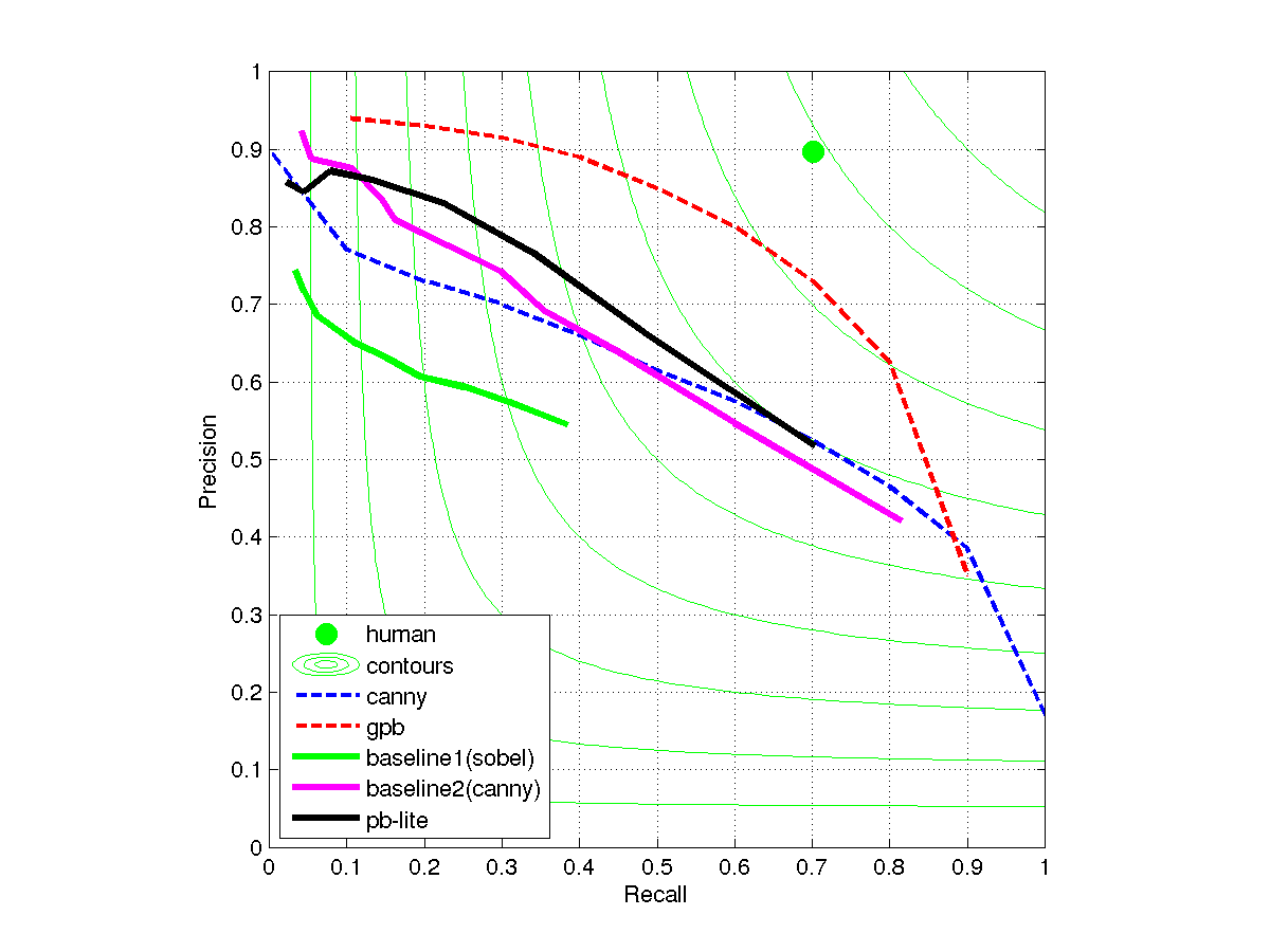Here are the results of my boundary detection as compared to the canny and sobel baselines, the state of the art algorithm (gpb), and a human baseline.