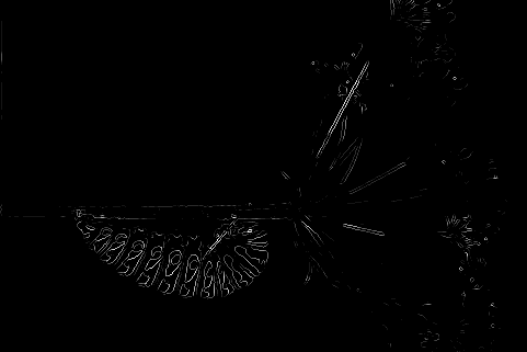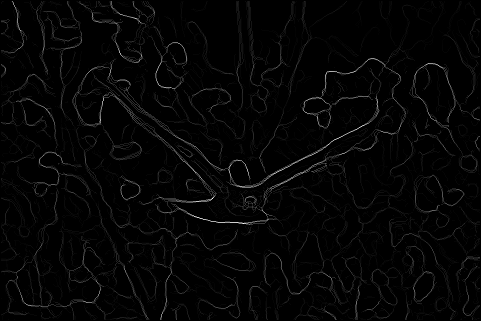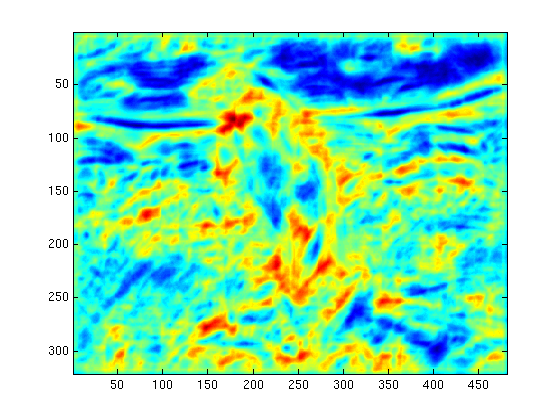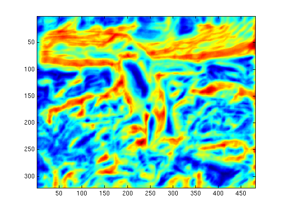 Areas with similar texture should respond similarly when convolved with each filter. For example, an area with many vertical lines will respond strongly to the horizontal derivative filters only, while an area with a spotted texture will have a somewhat average response for all orientations. We convolve the input image with each image in the filter bank to get a filter response vector for each pixel in the image. We then run a k-means algorithm (I used k = 64) to group these filter response vectors into descrete "textons." An example texton map is shown below.