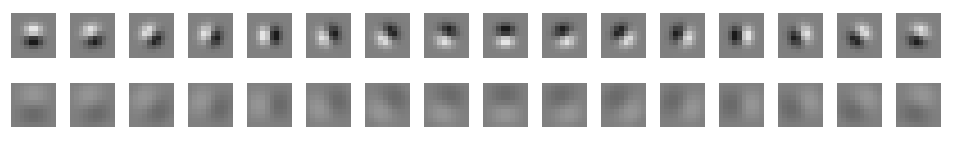 The first problem to solve is classifying texture. By definition, textures have repeated elements, and we use this to our advantage. We first generate a set of filters. Each is a derivative operator convolved with a gaussian, which measures the brightness change in a particular direction over a section of the image. In order to capture different size sections and different directions of change, we have several different radii for the gaussian function and several different orientations for the derivative direction. The filter bank that I used (with two radii and 16 orientations) is shown below.