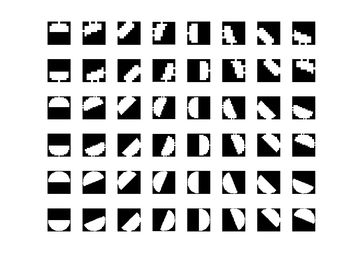 We next compute oriented gradients of textons and binned pixel brightness values at each pixel. To do this efficently, we define half disc masks that capture only the pixels on one side of an oriented boundary. We take two opposing half discs centered at the same pixel and look at the difference in their texton and brightness responses. This gives us a decent measure of the probability that this pixel is a boundary of a certain orientation. For each pixel, we average these gradients for both brightness and texton images and factor in a canny baseline to get our final boundary probability. Below are the half discs of different scales and orientations that I used.