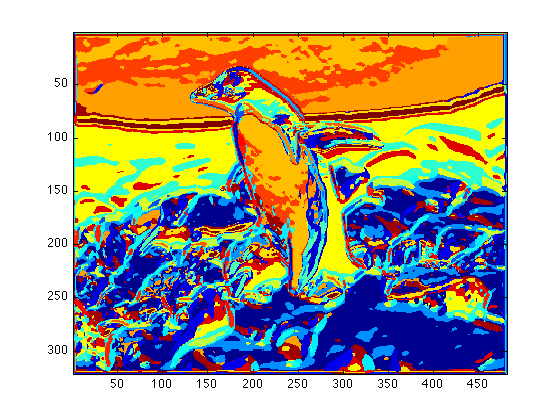 The kmeans procedure is intended to clump together areas of the image with comparable textures. Here is an example of a texton map, using different colors to indicate different texton regions: