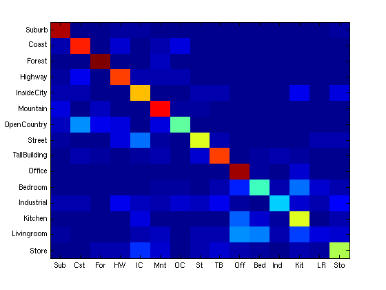 The best results I got were achieved with a larger feature size. Smaller features are the worst for the living room images, which typically have large objects in the foreground and very little small object similarity. With larger feature size I was able to achieve a better than random result for this category.