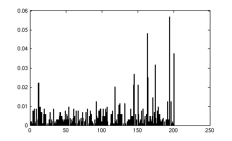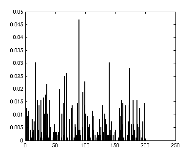 The next step is analyzing the training database and teaching the SVM. Now that we have our vocabulary of visual words, we can describe any image by what visual words are seen in the image. For each image in the training set we get a dense set of local features and for each we find the word in our vocabulary that best describes it. Then, we build a histogram with these words that describes the image. 2 different images and their visual word histograms are shown below. Notice that the different images are represented by very different visual word distributions.