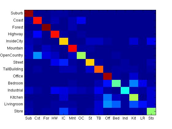 The living room classifier performs extremely badly. This may be because the definition of a living room is very broad. Many of these images were classified as offices or stores. It makes sense that a living room, which contains chairs and tables, would look like an office. I am not sure why it might look just as similar to a store. Also, the classifier was bad at deciding an image was a street. Many of the streets were classified as inside city. This seems very reasonable as many of the inside city images are along streets. The classification of natural images was much more successful. Open country was the worst, however. Most of the images that were classified wrong were classified as coast or mountain instead. I found this confusion with my scenes as well. I think that since all three have large, basically flat regions they could be confused easily.