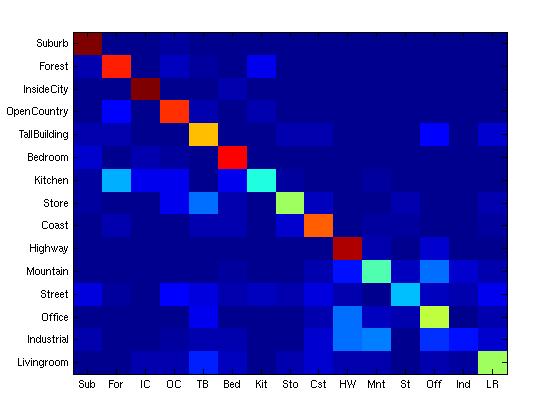 class of the image) into a linear SVM. We did not find that adjusting the SVM parameters had much effect on the accuracy of the scene classifications,