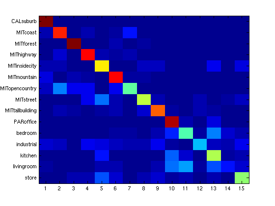Now we have everything we need to start classifying test images. For each test image, find its histogram. Then, multiply its histogram with each classifier (and add the bias for that classifier). Find which multiplication resulted in the highest confidence value. Hopefully, the classifier for the correct image category produced the highest confidence!