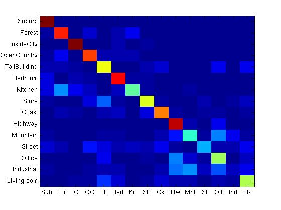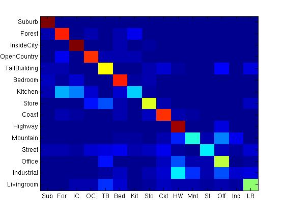 Starting with a small set of images from 15 scene database (described in Lazebnik et al. 2006), we picked up features at random and clustered them into a vocabulary of visual words using kmeans. After representing each training image in these visual words we trained a SVM and generated models for each category. Using these models we then classified the test images into 1 of those categories and calculated our performanceBase Level Performance (No Optimization)