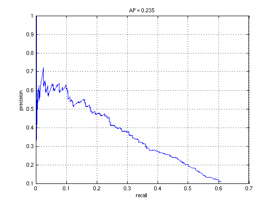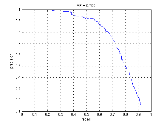 Here is the same SIFT descriptor from above but run on 200 less training images. It is marginally worse:Our AP is .768, with curve: