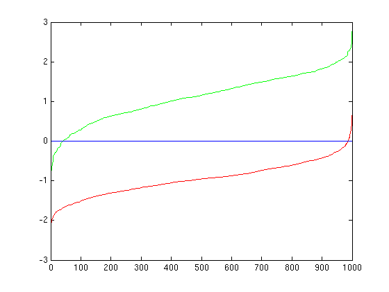 Before I used the non-linear SVM, I tried to intelligently select the SVM parameters lambda (regularization) and sigma (RBF exponent). The plots below show the RBF kernel with different values of sigma. I selected sigma = 550 because it seemed to offer the best separation between the positive and negative training examples. The positive examples were values 1-1000 and the negatives 1001-2000.