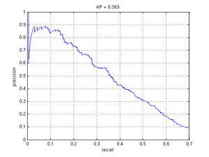 The next step in improving the detector was to train using hard negatives. As a small speed-up I cached the calculation of features for the hard negative training examples. The plot below shows that just one pass of adding hard negative examples to the training set improved average precision by 0.04.