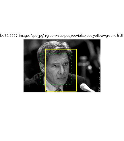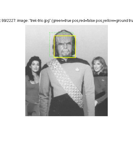 Rather than training on raw image data, we convert each of our training images to a SIFT descriptor, which is invariant under many non-relevant transformations (such as lighting). We then use an SVM to construct a boundary between faces and non-faces in SIFT space. The result of this work is a (rather poor) classifier for distinguishing between faces and non-faces. I get an average precision recall of around 28% for this classifier: