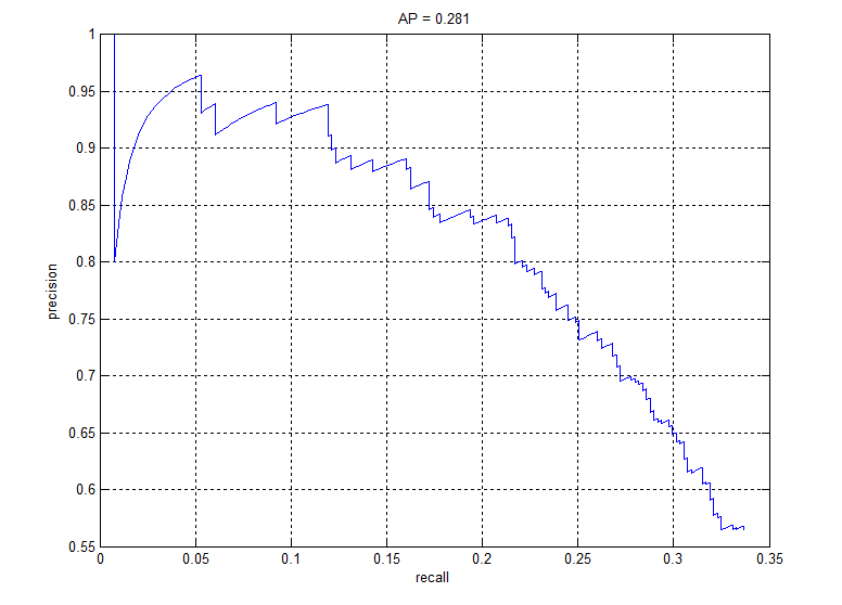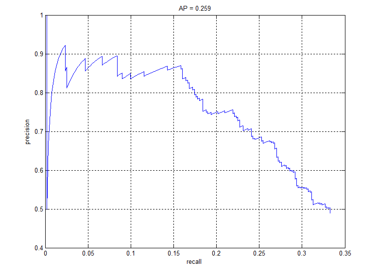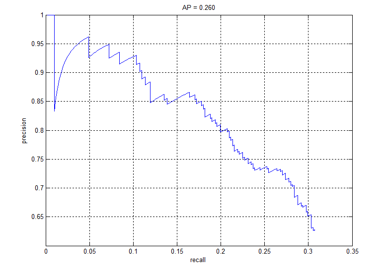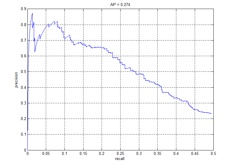 Fig. 3: Precision recall graph for linear SVM classifier ran for one iteration of getting random negatives and one iteration of hard negatives