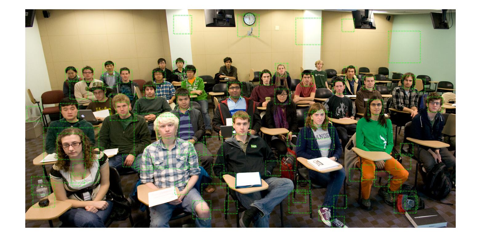 When the trained classifer was tested over the class photo, using the non-linear classifier with hard-negatives, the following detections were obtained. As can be seen, there are too many false positives but still all the faces other than three were detected.